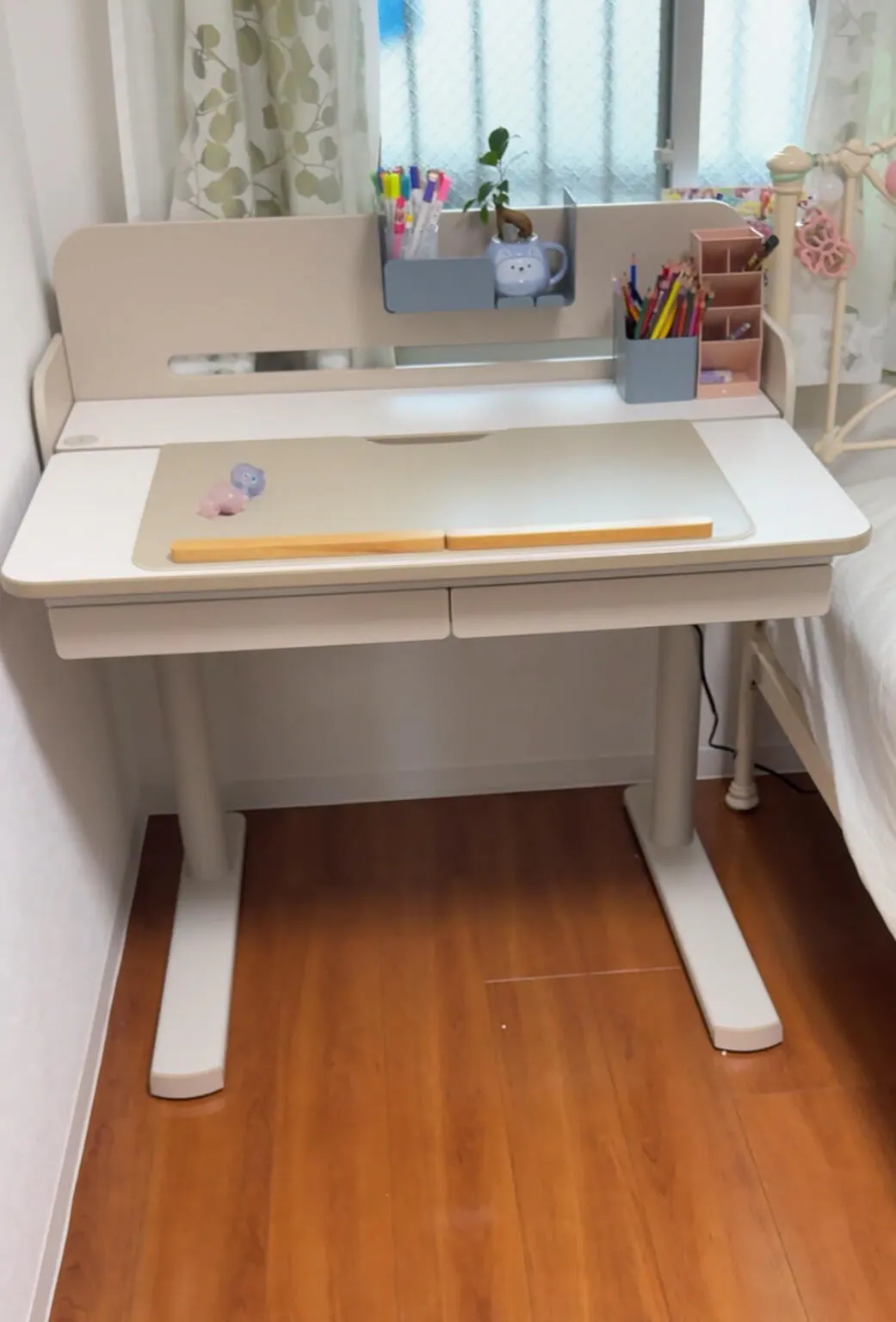 お気に入りの小物やタブレットを置くのにぴったり。正面の小さな凹みは、充電ケーブルの端子を固定しやすく、デスクまわりがすっきり整います。